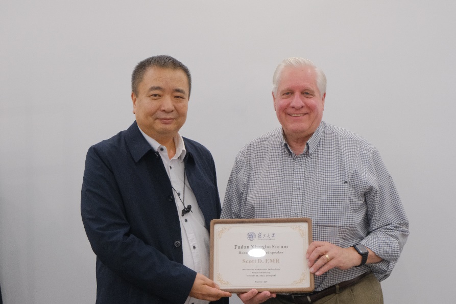 2025世界顶尖科学家协会“生命科学或医学奖”获奖者做客复旦大学相伯讲堂暨谈家桢生命科学讲坛2025年10月23日,复旦大学相伯讲堂暨谈家桢生命科学讲坛在江湾校区举行。2025世界顶尖科学家协会奖“生命科学或医学奖”的两位获奖者,美国科学院院士、康奈尔大学分子生物学与遗传学系细胞与分子生物学名誉教授Scott D. EMR,美国科学院院士、犹他大学生物化学系特聘教授兼系主任Wesley SUNDQUIST与师生开展交流并作分享报告。复旦大学校长、中国科学院院士金力向两位主讲人颁发“复旦大学相伯讲堂”荣誉证书。两位主讲人因“在受体膜蛋白转运与降解细胞机制研究中的突破性发现”而获得2025世界顶尖科学家协会奖“生命科学或医学奖”,该机制与病毒出芽、感染进程及艾滋病药物干预密切相关。Scott D. EMR作了题为“The ESCRT Pathway: Sorting out membrane protein traffic to the lysosome”的精彩报告。他回顾了从1976年至今近50年的学术生涯,从哈佛大学和加州大学伯克利分校求学,到加州理工学院成立自己实验室,再到加州大学圣